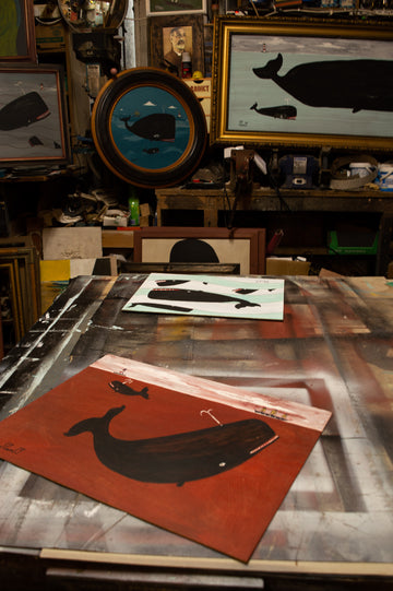 I think the first whale painting was after I just retired from building, and on holiday I bought two 1950s watercolours from a charity shop in Carmarthen, Wales. They were of whaling ships, which I thought was an unusual subject. I decided to paint a whale, put it into an old frame, and sold it online for a few quid. So I started to paint more and do the same. I was so surprised when a few months later Sailors Jail contacted me to exhibit them, but I think it’s great that so many people like my paintings.’