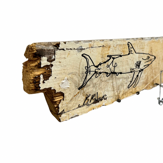Original wire drawing 'Shark' mixed automata on wood by Falmouth-based artist Ben Baker.