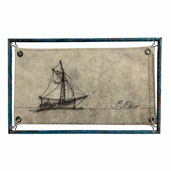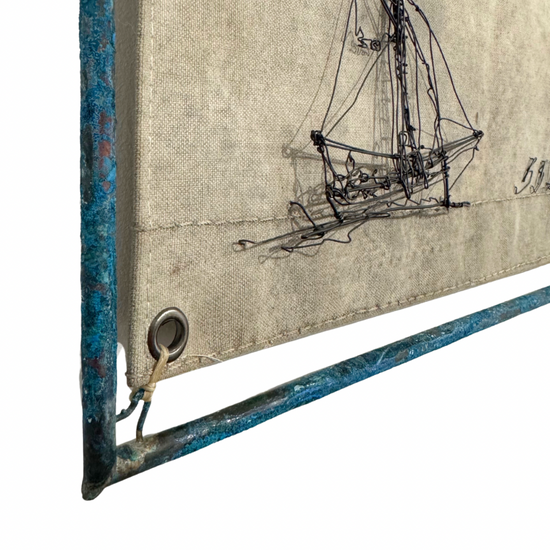 Original wire drawing 'Ship' on canvas by Falmouth-based artist Ben Baker.