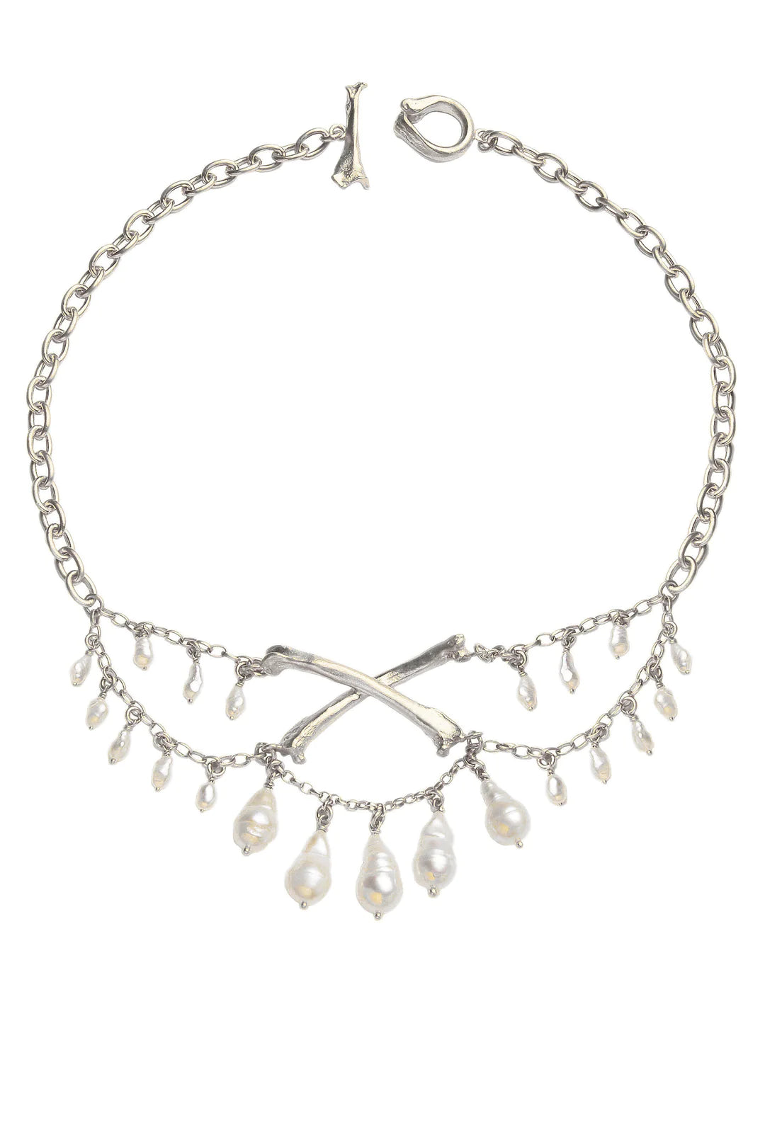 Magpie Crossbones & Baroque Rice Pearls & Baroque Pear Shaped Pearls Chain Necklace
