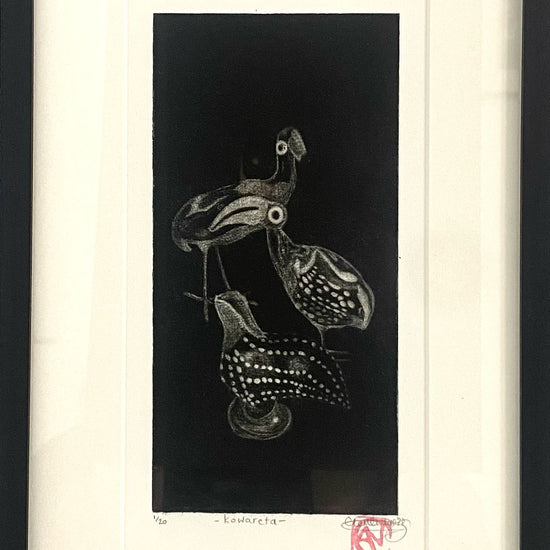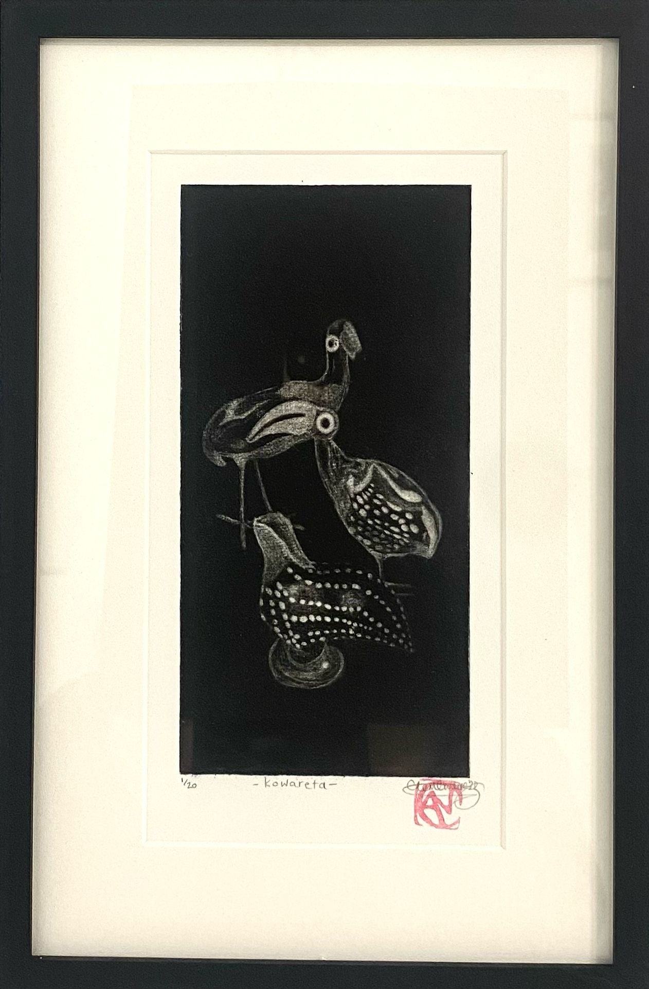 Framed original aquatint etching ' Kowareta' by printmaker Clementine Neild. 1/20