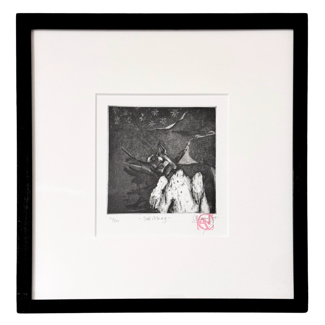Using aquatint and etched mark-making, Clementine creates darker images that she then burnishes back to add lighter grey tones, highlights and more subtle tone changes; similar to mezzotint. Her plates go through many processes overlaying etching, burnishing, and open bite, which create the depth of mark her work is known for.