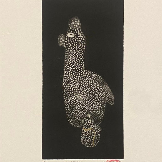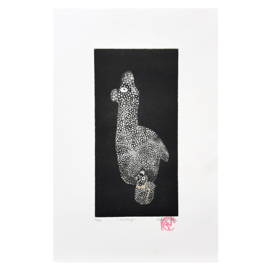 Using aquatint and etched mark-making, Clementine creates darker images that she then burnishes back to add lighter grey tones, highlights and more subtle tone changes; similar to mezzotint. Her plates go through many processes overlaying etching, burnishing, and open bite, which create the depth of mark her work is known for.