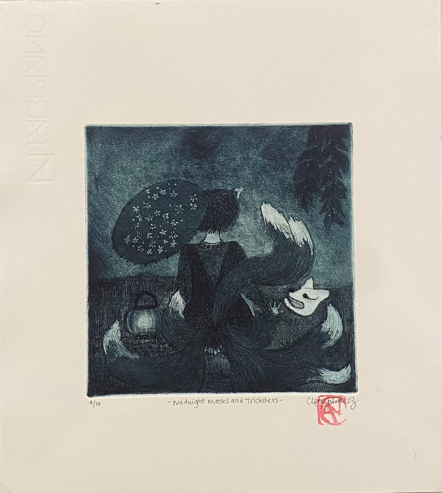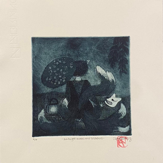 Original aquatint etching 'Midnight Masks & Tricksters' by printmaker Clementine Neild. 4/10