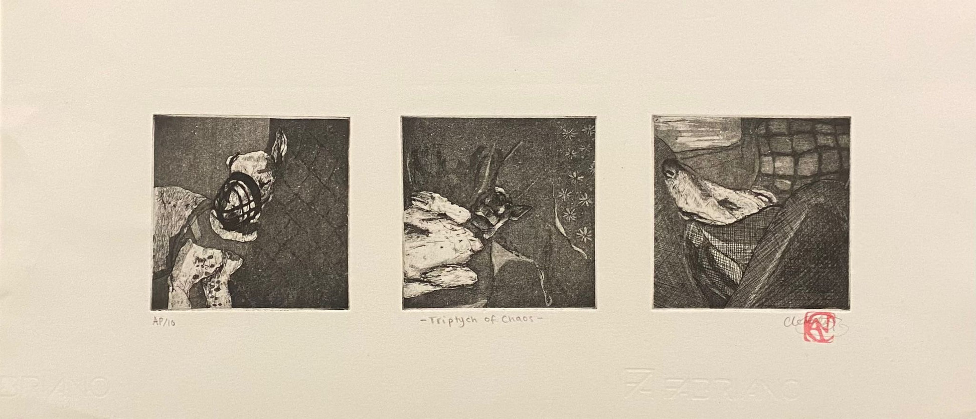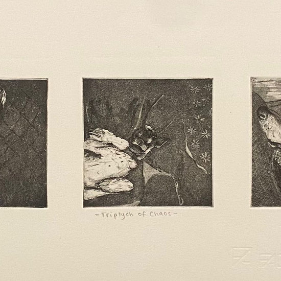 Original etchings 'Triptych of Chaos' by printmaker Clementine Neild.