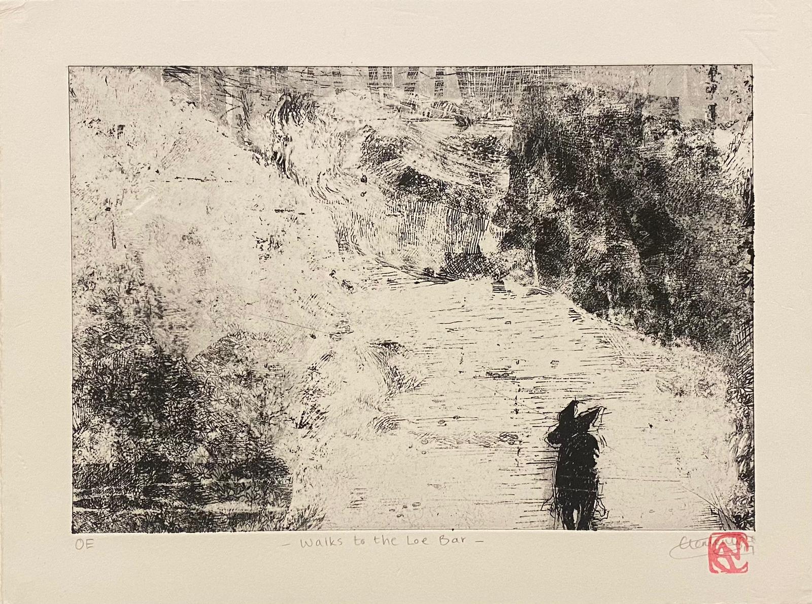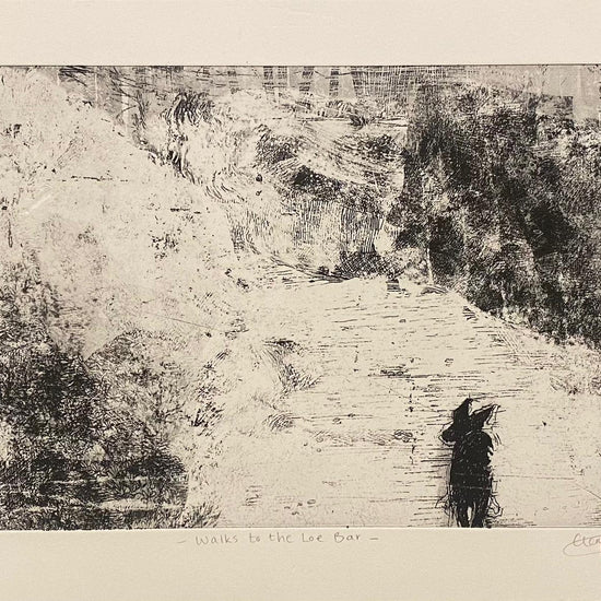 Original photomolymer print 'Walks to the Loe Bar' by printmaker Clementine Neild.