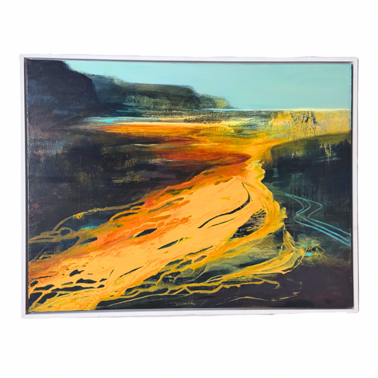 'I paint semi-abstract landscapes inspired by wild places, including the beautiful Cornish coastline where I am lucky enough to live. I walk every day with my dog, frequently on the beaches and coast path, (and even been known to get up close and personal with rockpools by cold water dipping.) Sometimes I sketch, but more often I take many many photos of the little details that catch my eye. It is not just big spaces of ocean and sky that I connect with but patterns made in the sand by the withdrawing tide, or the folds and crevices within a rock or pebble. Being in nature brings me into the present whether that is battling against a strong wind on a headland or basking in the sun in a sheltered cove. It is these feelings of freedom, serenity and aliveness I wish to convey in my paintings. It is an ongoing journey of discovery.'