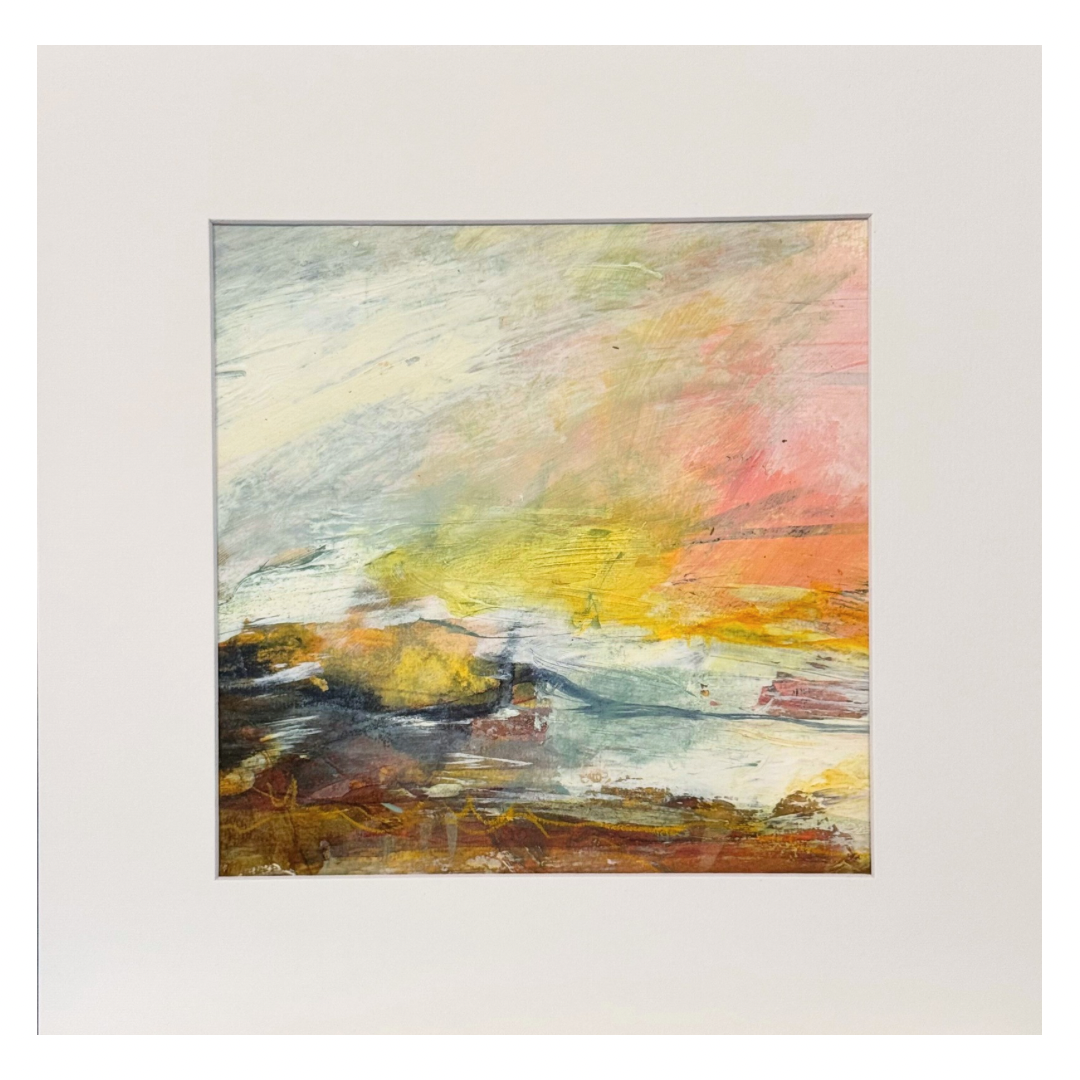 'I paint semi-abstract landscapes inspired by wild places, including the beautiful Cornish coastline where I am lucky enough to live. I walk every day with my dog, frequently on the beaches and coast path, (and even been known to get up close and personal with rockpools by cold water dipping.) Sometimes I sketch, but more often I take many many photos of the little details that catch my eye. It is not just big spaces of ocean and sky that I connect with but patterns made in the sand by the withdrawing tide, or the folds and crevices within a rock or pebble. Being in nature brings me into the present whether that is battling against a strong wind on a headland or basking in the sun in a sheltered cove. It is these feelings of freedom, serenity and aliveness I wish to convey in my paintings. It is an ongoing journey of discovery.'