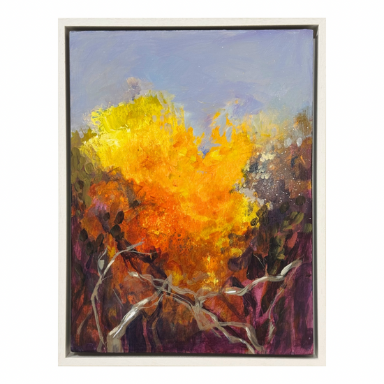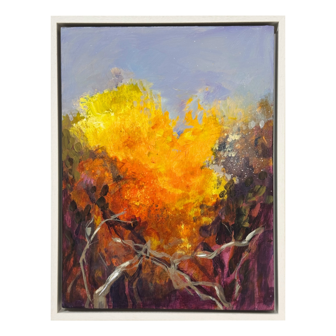 Materials: Acrylic and mixed media on wood. Sealed with a UV resistant varnish. White wooden frame.