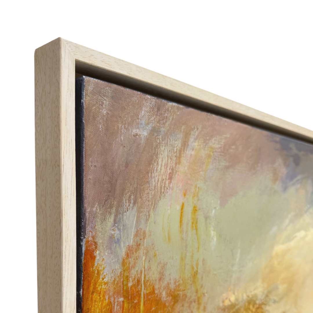Materials: Acrylic and mixed media on wood. Sealed with a UV resistant varnish. White wooden frame.