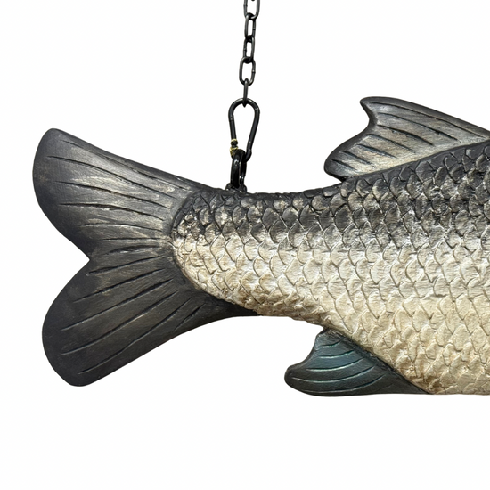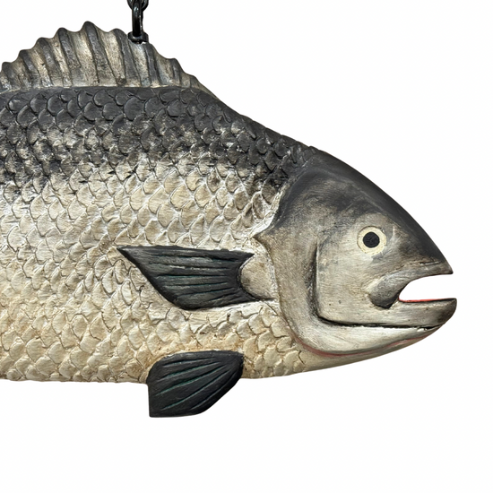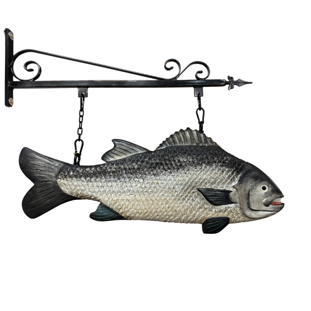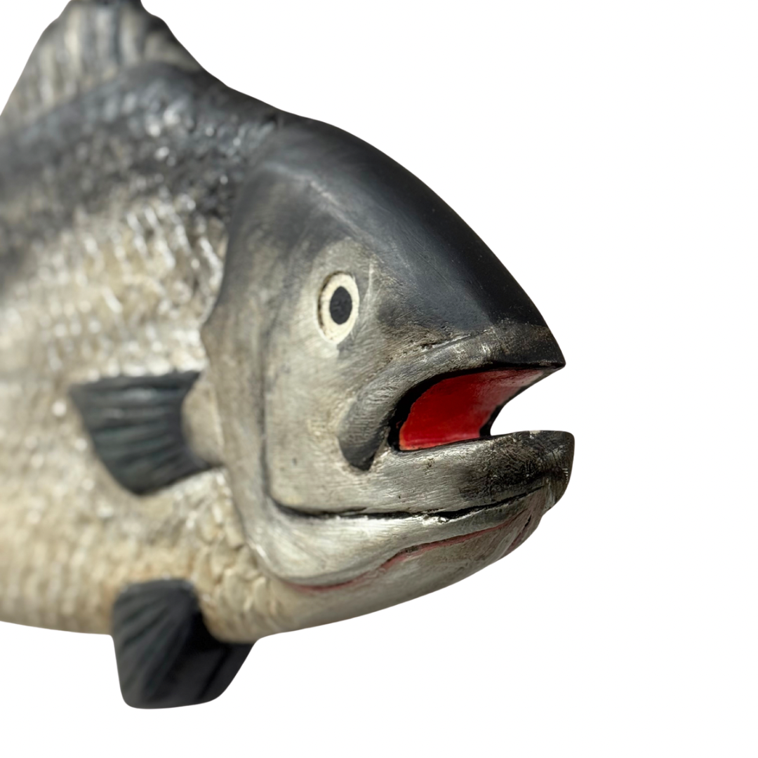 Original hand-carved wooden bass sculpture, by Cornwall-based artist James Heslip. This stunning piece is carved from iroko wood, and is hand painted. It hangs from a metal wall fixture, like a traditional wooden sign.