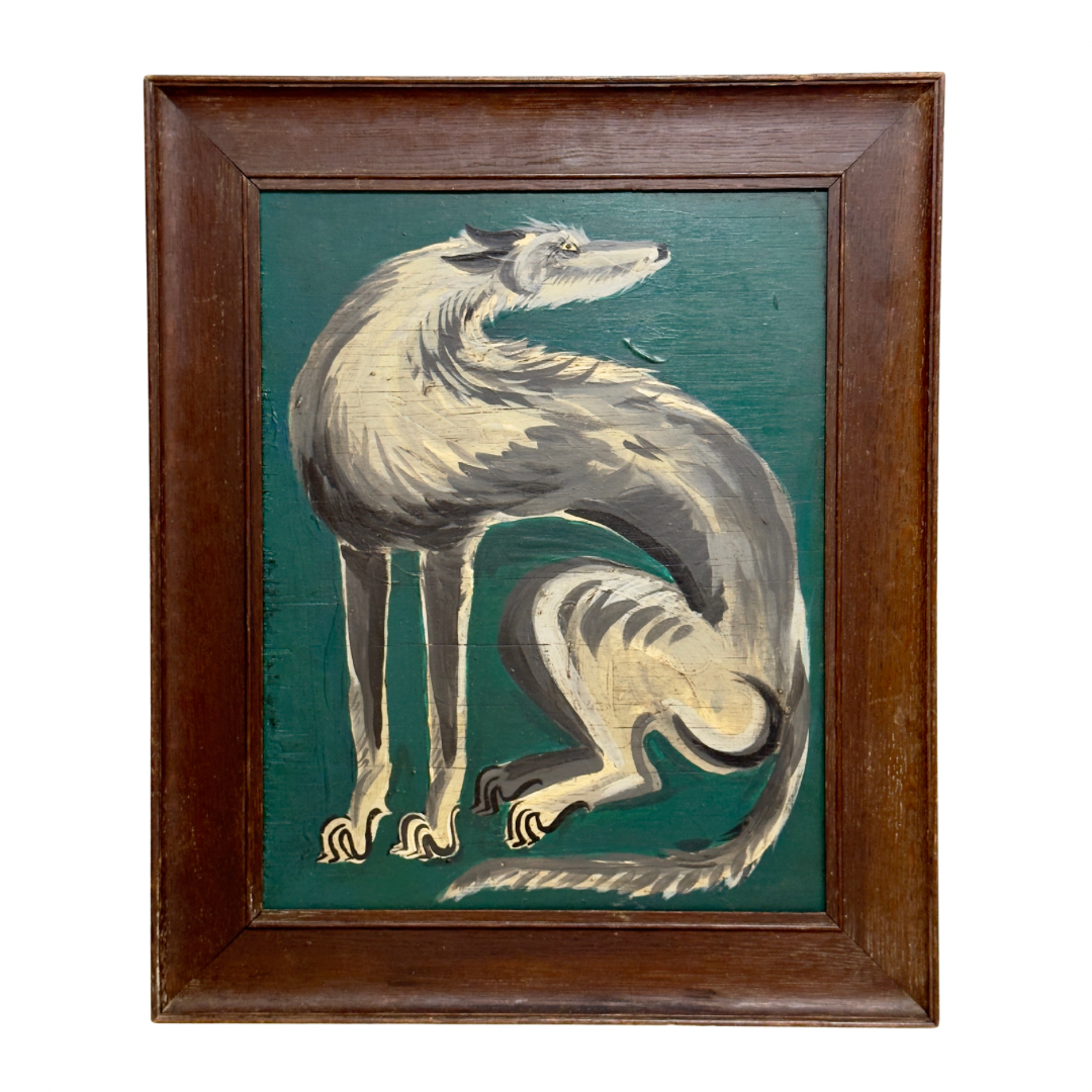 Original painting ‘Grey Lurcher Seated’ in a wooden frame by artist James Heslip.