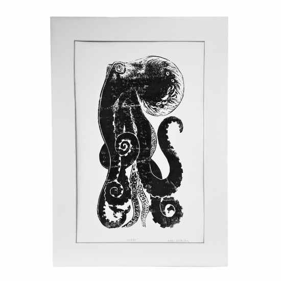 An original lino print ‘Sucker’ on paper in frame mount by local Cornish artist Katy Gusterson.