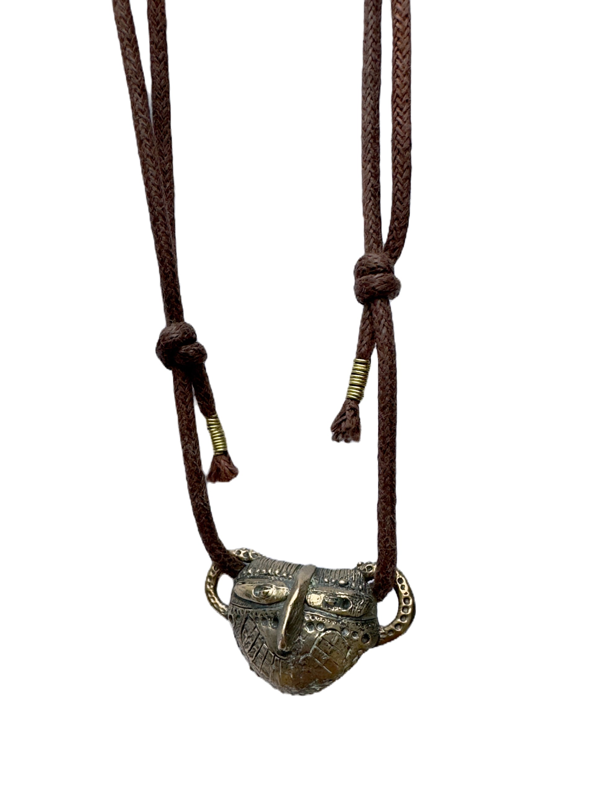 Original one-off hand-cast bronze face pendant necklace on brown cord by local Falmouth-based Artist Natasha Ratcliffe.