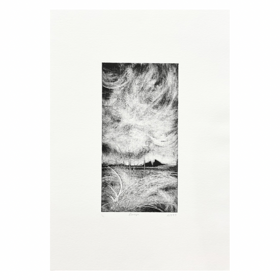 Niamh Spink is a printmaker from Yorkshire who studied at Falmouth University. Her work was inspired by the Cornish landscape during her studies. She is especially passionate about creating movement in her work, like the wind over grass or the peaks of waves. She often captures this on location when she brings her sketchbook on walks along the coastal path. Her favourite way to do this is on a large scale, using her whole arm to make gestures over the ink, giving her work the texture and movement of the landscape.