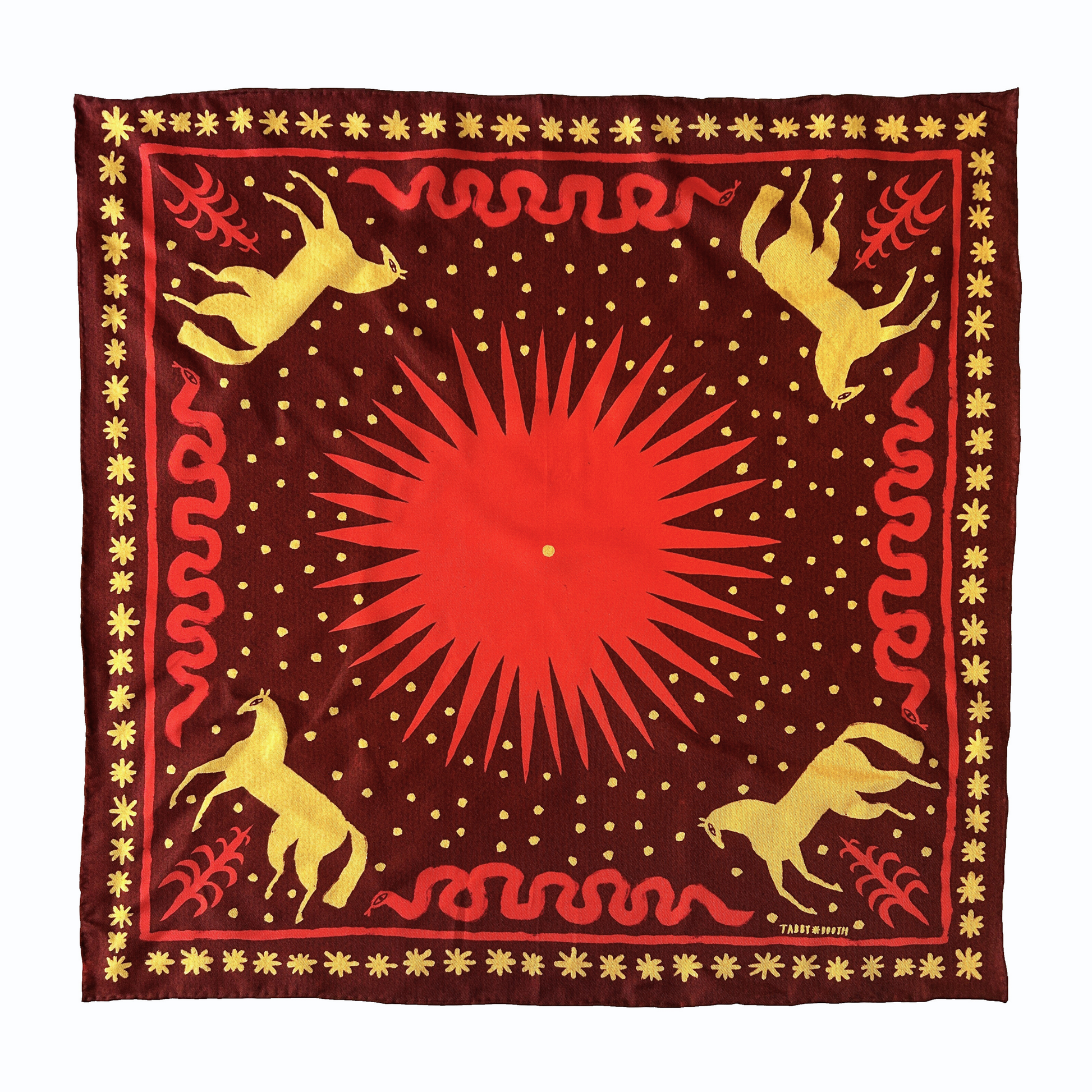 Beautiful Hermes quality 100% silk scarf with hand rolled hems, printed with Tabby Booth's Ranch design.