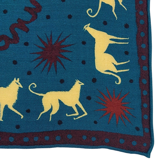 Crafted from a wool-silk blend, this scarf feels luxurious and soft to the touch. Finished with hand-rolled hems and printed with Tabby Booth's Hound Dog design.