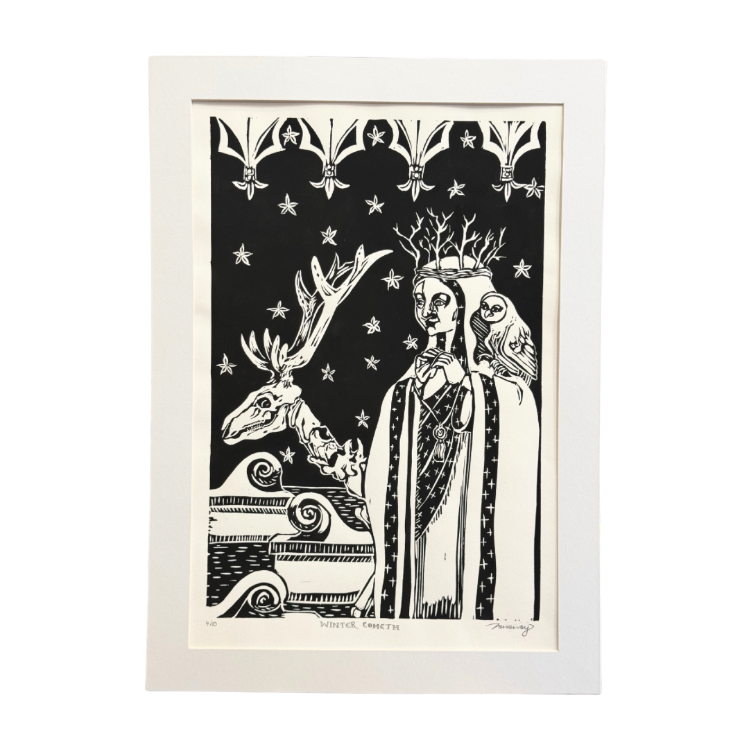 Original Linocut print ‘Winter Cometh’ by local printmaker Tamsyn Swingler.