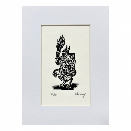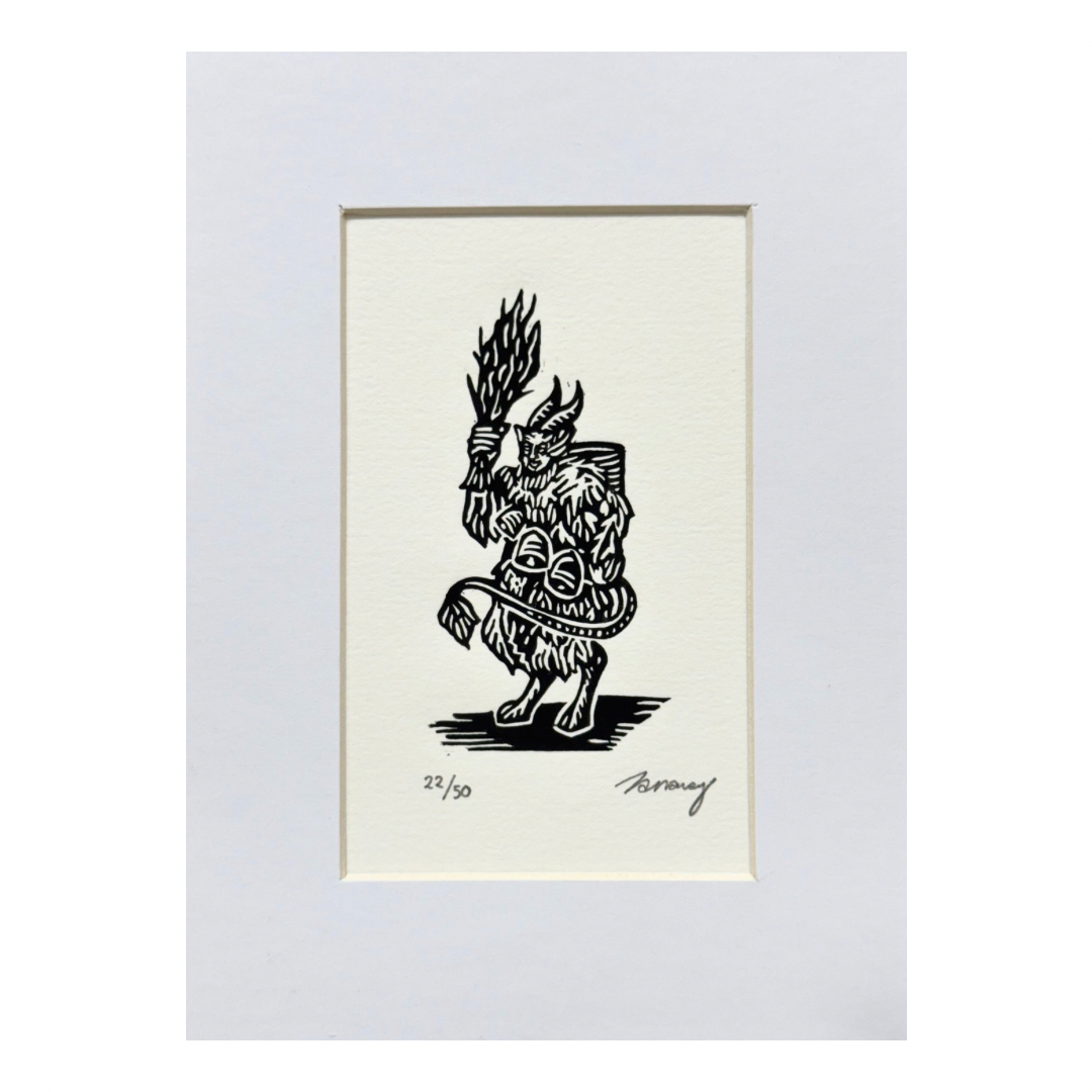 Original linocut print ‘Littlest Krampus’ by local printmaker Tamsyn Swingler.
