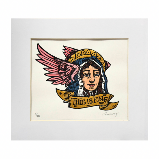 Original linocut print ‘The Patron Saint of Brave Faces’ by local artist Tamsyn Swingler