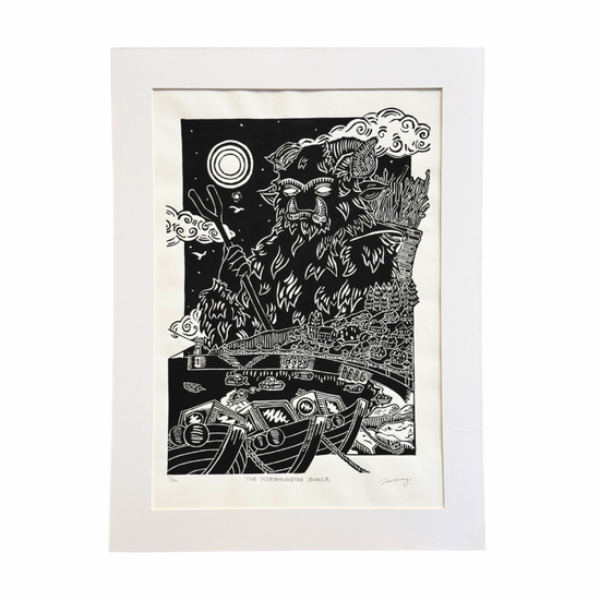 Working under the name Tarraway Hoofpress, Tamsyn creates lino prints that delve into the strange and storied worlds of folklore, devilry, and eccentric tradition. Her work draws on Cornish legends, mischievous spirits, and old tales, weaving them into bold, hand-pressed prints.