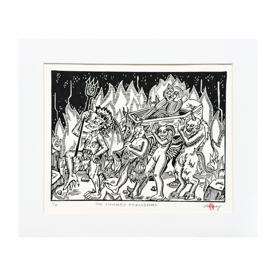 Original Linocut print ‘The Sinners Procession’ by local printmaker Tamsyn Swingler.