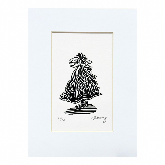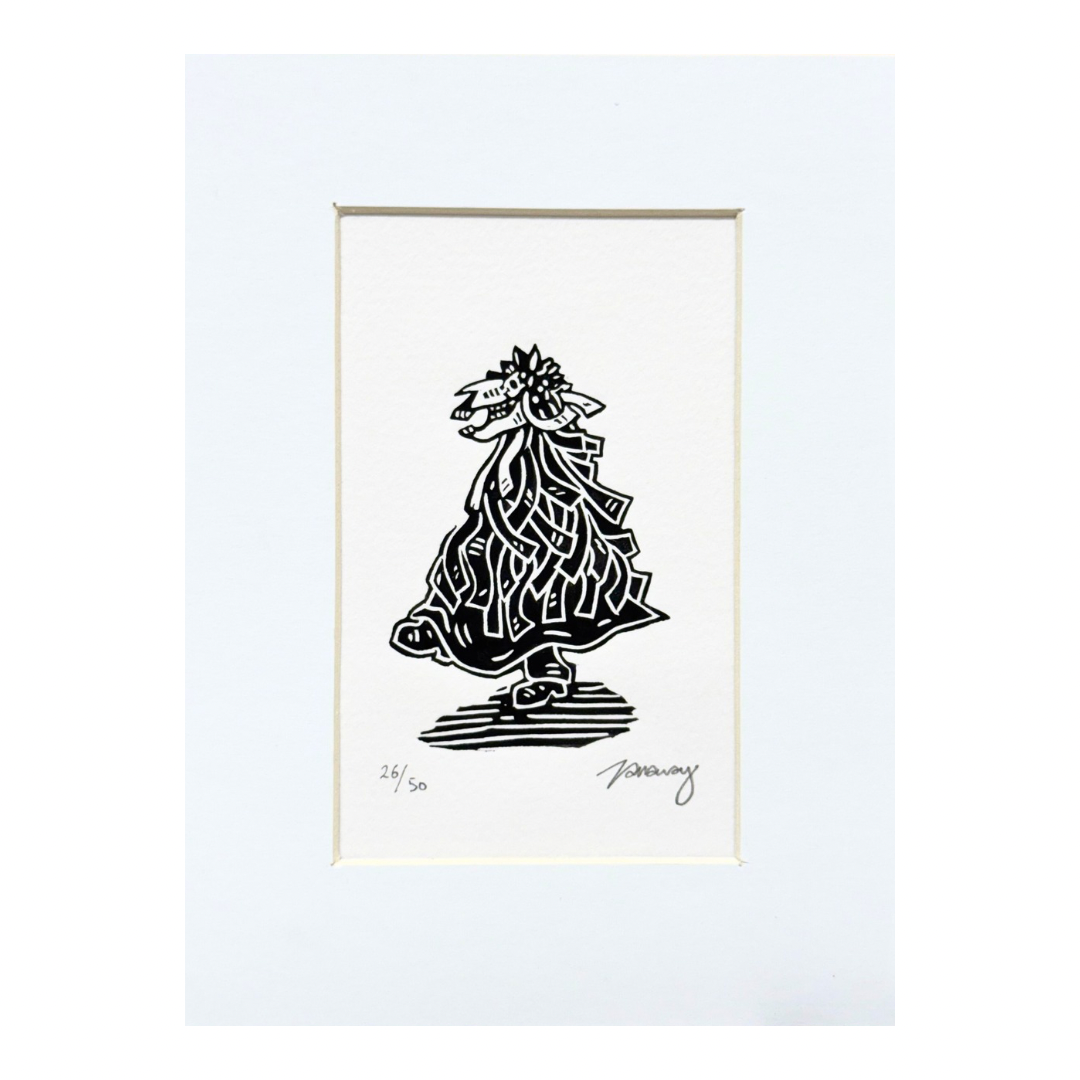 The name “Tarraway” nods to a Rumplestiltskin-like Cornish devil from an old guise play, while “Hoofpress” imagines a cloven-footed imp stamping out prints—though in truth, she uses a humble spoon. With a love for role reversals, festive misrule, and peculiar clergy, Tamsyn’s work celebrates the uncanny and the forgotten, especially the rich, tangled history of Cornwall.