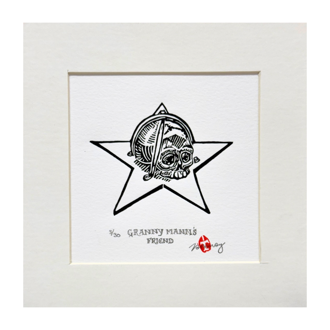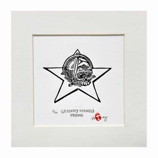Original Linocut print ‘Granny Mann’s Friend’ by local printmaker Tamsyn Swingler.
