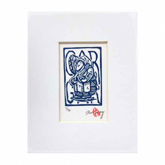 Original linocut print ‘Gar Gar’ in blue by local printmaker Tamsyn Swingler