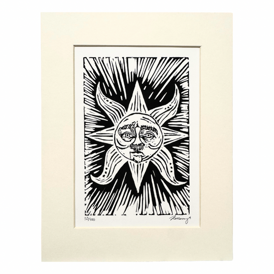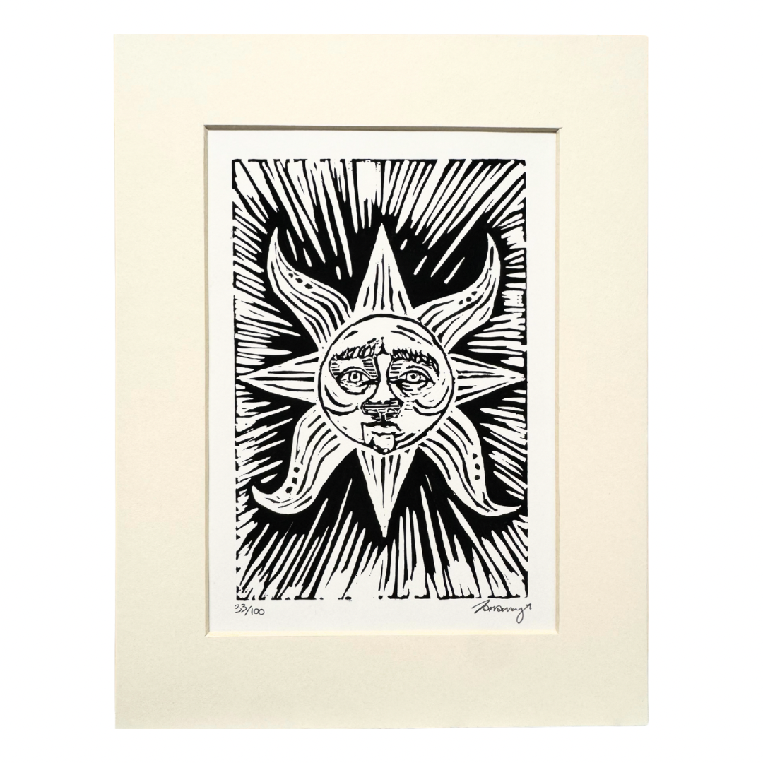 Original linocut print ‘The Sun Resplendent’ by local printmaker Tamsyn Swingler.