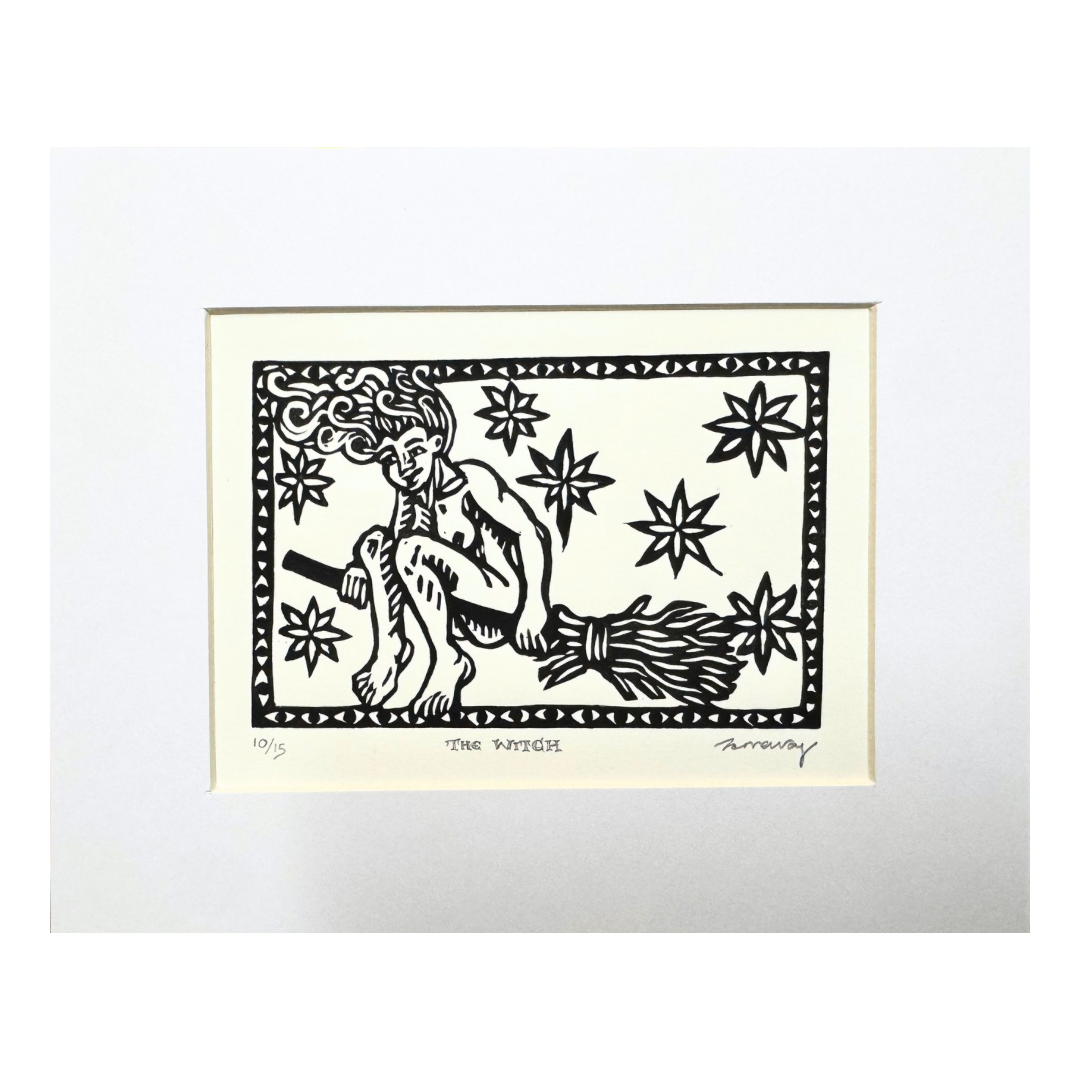 Original linocut print ‘The Witch’ by local printmaker Tamsyn Swingler.