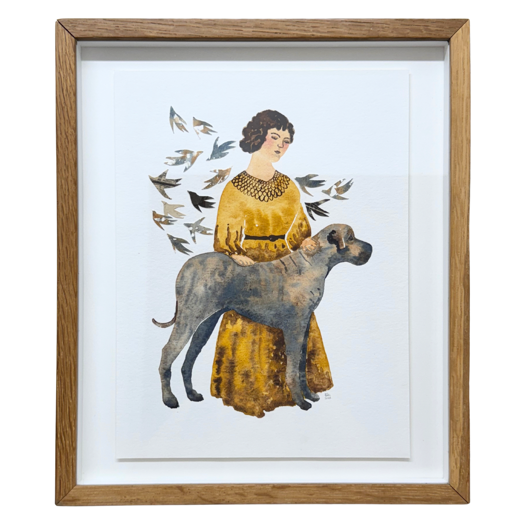 Original framed watercolour painting ‘It Was Me And The Birds And The Dog Again’ by local artist Tanya McBride. Watercolour and collage, protected by glass.