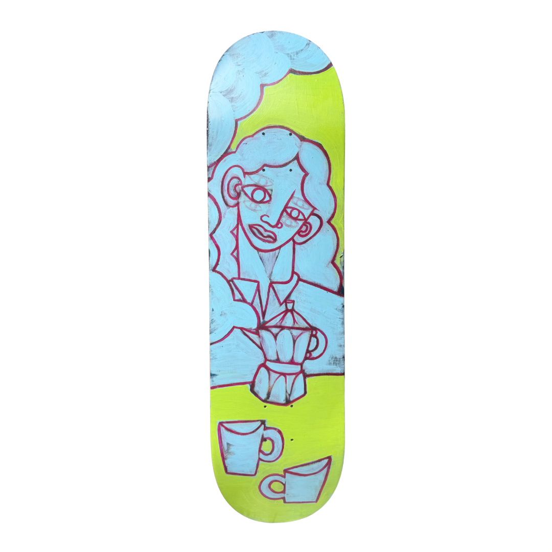 Original artwork ‘Morning Fix’ by Falmouth-based artist Vaughan Baker. Mixed media on a skateboard.